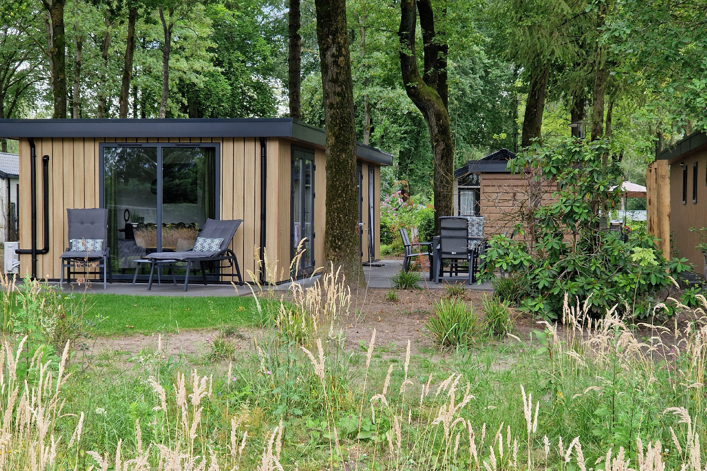 Een rustig gelegen vakantie huisje/chalet WOOD386 in de bosrand met een ruim en vrij uitzicht over een natuurlijk veld. Naast en voor het chalet is een royale zit- of eet gelegenheid, in de halfschaduw door de karakteristieke volwassen bomen. De eigenaren hebben in 2024 dit nieuwe chalet gekocht >>