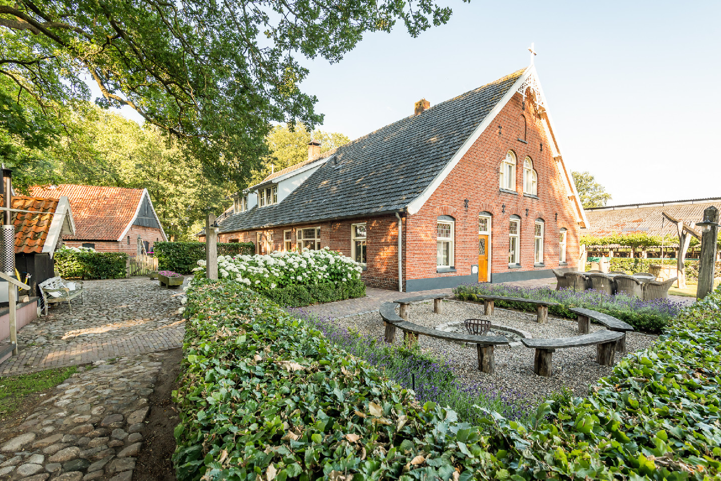 Zodra je het erf op rijdt, voel je het meteen. Rust. Ruimte. Authentiek buitenleven. De smalle entree wordt omlijst door indrukwekkende, oeroude eikenbomen en leidt je naar een karakteristieke boerderij met rijkelijk versierde gevels, ronde ramen en klassieke niendeuren met drie togen.