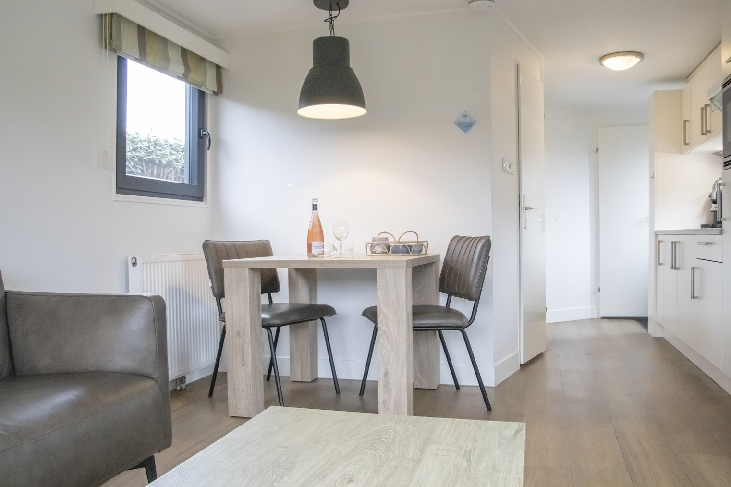 Elke bungalow is van alle gemakken voorzien, met een ruime woonkamer, een volledig ingerichte keuken inclusief vaatwasser, twee comfortabele slaapkamers en een praktische berging met wasmachine en droger. Een ideale plek voor een ontspannen verblijf, in elk seizoen.